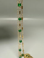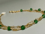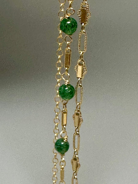 Designed with ten round 3.5mm jade toned aventurine stones; each stone is hand wired and wrapped in 14k gold-filled and attached to on a fancy link chain; complimented with a filigree link and open link bracelet; completed with spring ring clasp, heart closure and signature mother of pearl star.