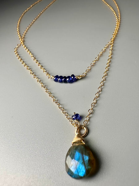 Double layering necklace features a blue faceted Labradorite pendant topped with small Natural blue sapphire rondelle; attached to a row of sapphires on a delicate own link chain, completed with a spring ring clasp, heart closure and signature mother of pearl star.