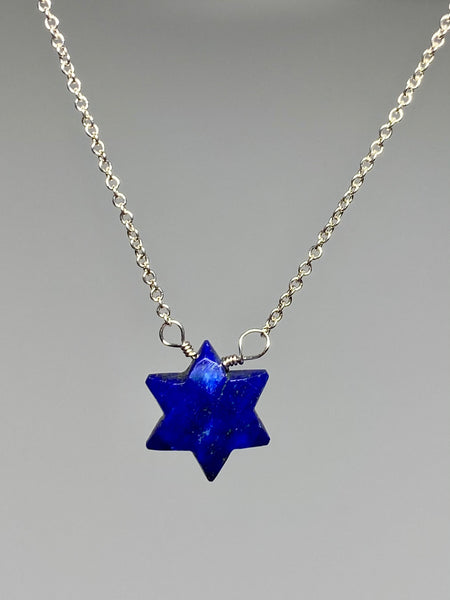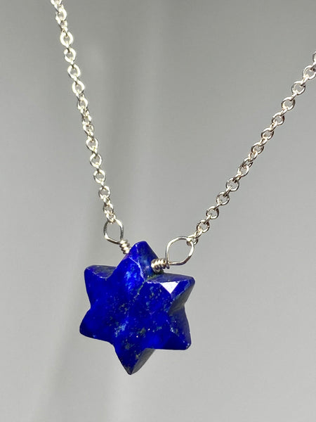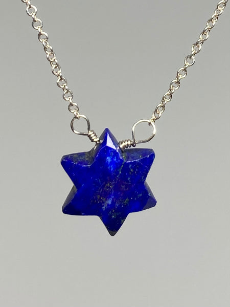 Centers a six point lapis lazuli star hand wired and wrapped on a delicate chain, completed with a spring ring clasp with heart closure