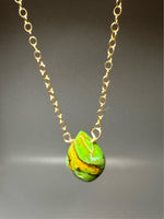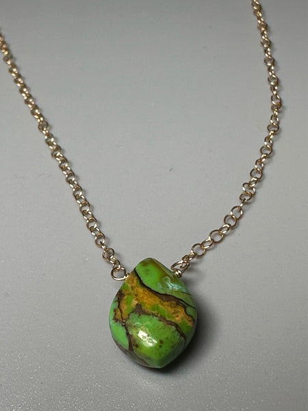 Smooth lime Turquoise drop attached to a 14k gold-filled chain. L: 16 1/2” completed with spring ring clasp and mother of pearl signature star.