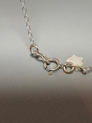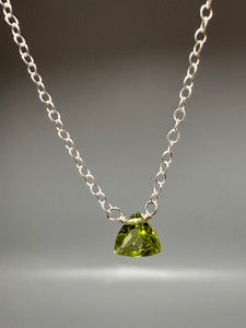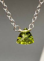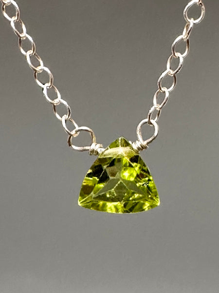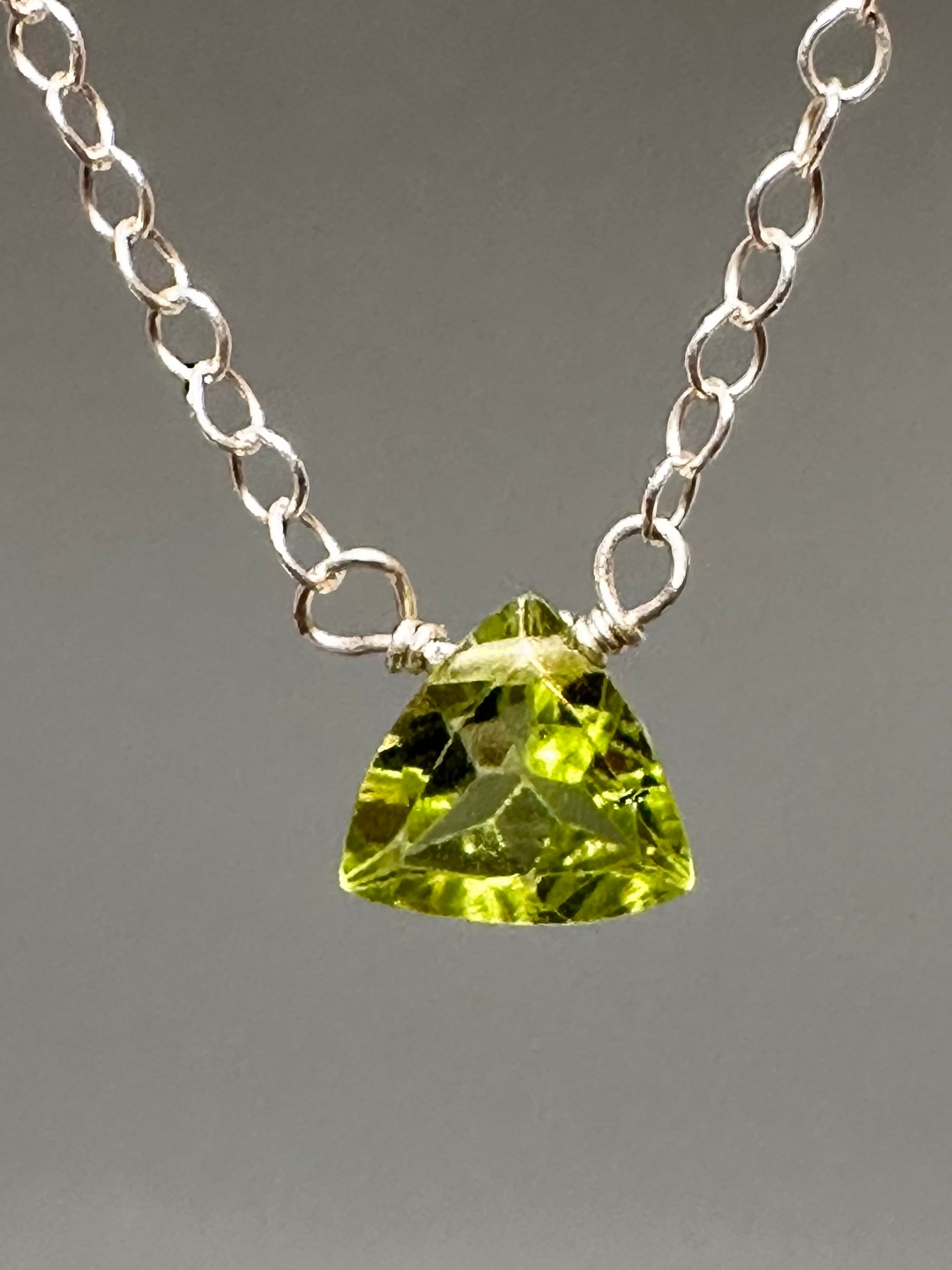 Centers a triangular cut apple green peridot set on a delicate open link sterling silver chain; completed with a 6mm springing clasp, heart closure and signature mother of pearl star.