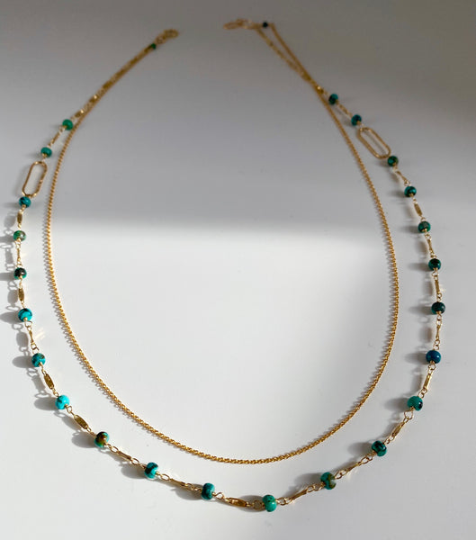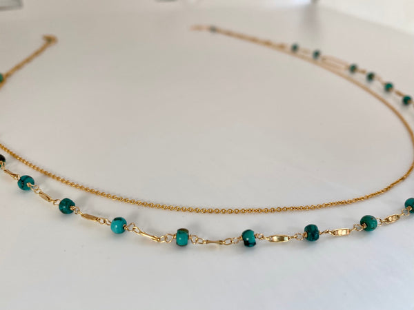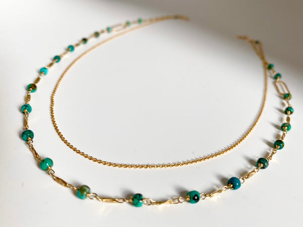 Features twenty four blue turquoise rondelles hand wired and wrapped on a stylized chain with textured rectangular link accents, topped with a delicate chain, spring ring clasp and signature mother of pearl star.