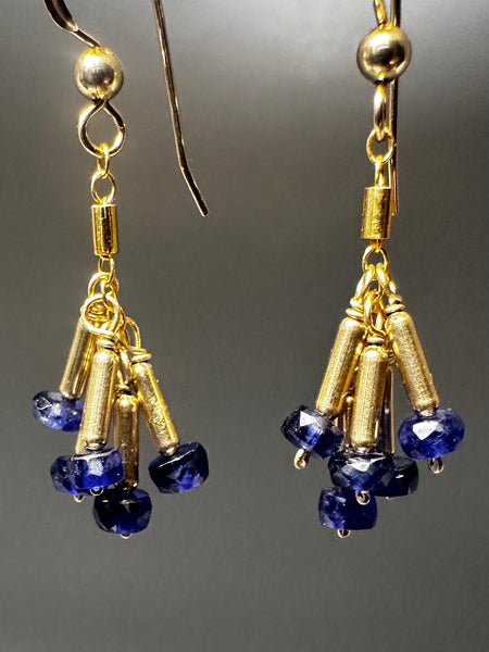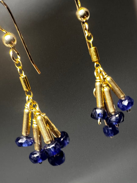 Features six vibrant blue sapphire faceted rondelles suspended from polished gold tubes. Hand-wired and wrapped in 14k gold-filled with ball and hook ear wires.