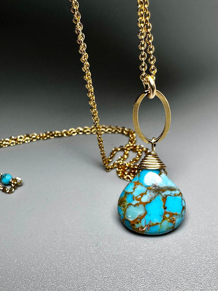 Features a teardrop Turquoise pendant, hand-wrapped in gold-filled wire and suspended from a delicate gold-filled open link with chain. Simple, striking, and effortlessly wearable—each stone is one of a kind, celebrating natural color and organic veining; complete with turquoise rondelles, spring ring clasp, heart closure and signature mother of pearl star.