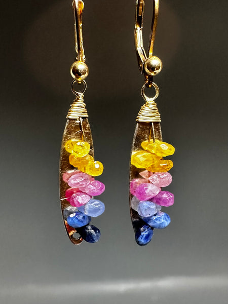 Features a cascade of natural sapphire briolettes in golden yellow, blush red-pink, and deep blue hues, wired-worked and attached to a curved gold-filled frame. Each stone is individually wrapped, completed with a ball and hook lever-back ear-wire.