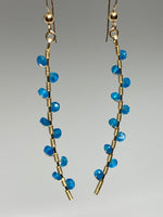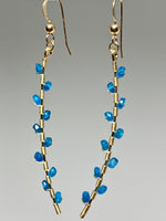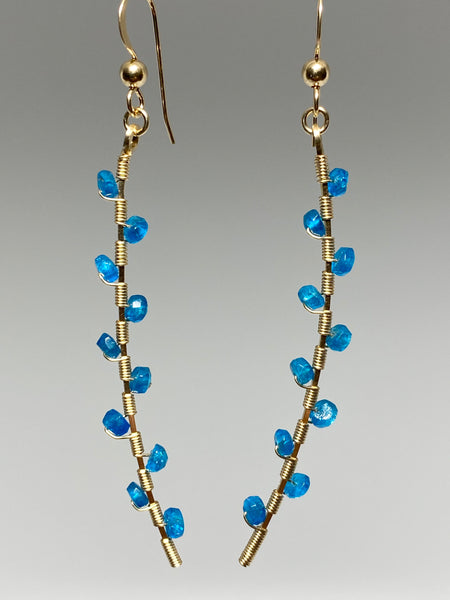 Features ten neon blue apatite stones hand wired and wrapped on a 14k gold filled stick, attached to a ball and hook earwire.