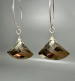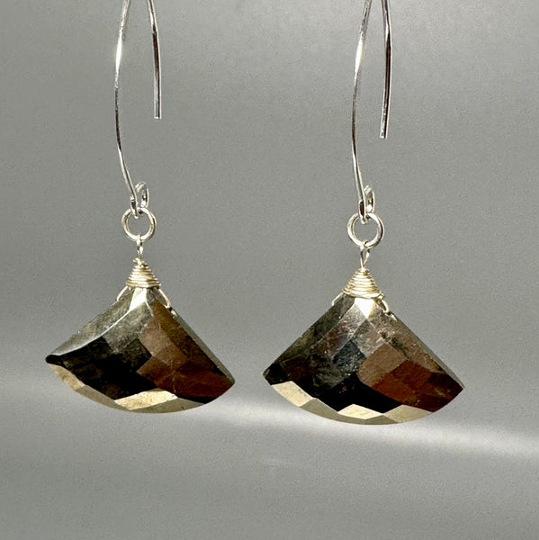 Features a faceted fan shaped pyrite stone hand wired and wrapped in sterling silver; attached to a stylized ear-wire