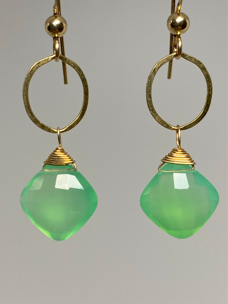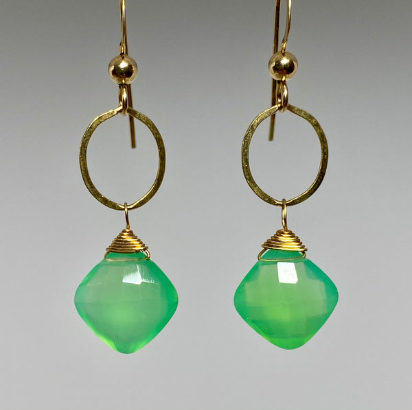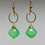 Features a diamond shaped faceted chrysoprase stone topped with a flat open circle, ball and hook ear-wire