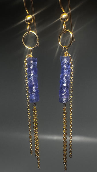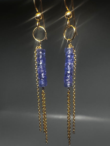 Each earrings features a vertical stack of faceted Tanzanite rondelles in a luminous periwinkle-blue hue, hand-wired with accents tassels, ball and hook ear-wire.
