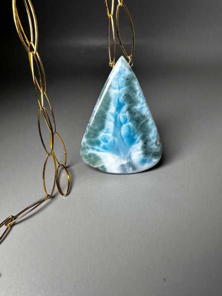 A striking, one-of-a-kind Larimar pendant in luminous shades of turquoise and seafoam, reminiscent of tranquil Caribbean waters. Suspended from a modern 14K gold-filled elongated link chain for effortless elegance.