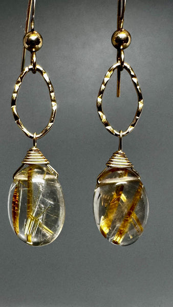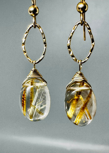 Handcrafted earrings featuring luminous golden rutilated quartz, prized for its natural golden needle inclusions—no two stones are ever alike. Each oval quartz drop is hand-wrapped and suspended from delicately hammered gold stylized link.
