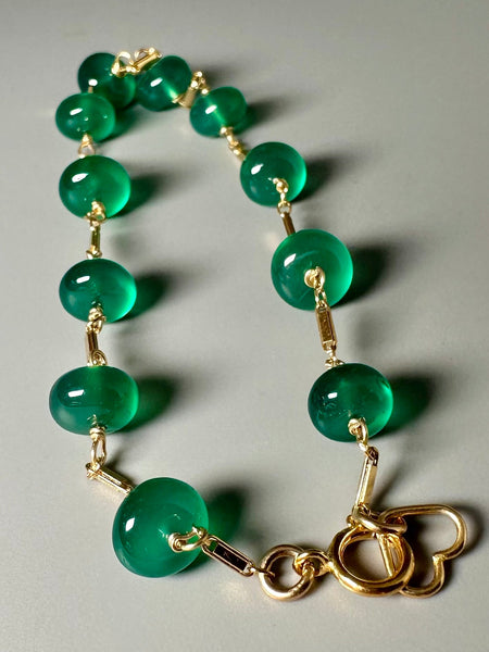 Features eleven smooth green onyx rondelles hand wired and wrapped on a bar and link chain; completed with a spring ring clasp and an open heart closure