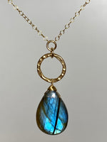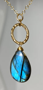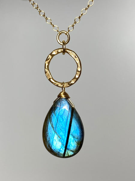 Centers a hammered circle suspending a hand wired and wrapped blue iridescent Labradorite stone; attached to a delicate open link chain completed with spring ring clasp, signature mother of pearl star and heart closure.