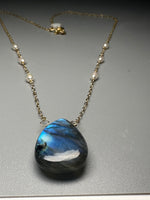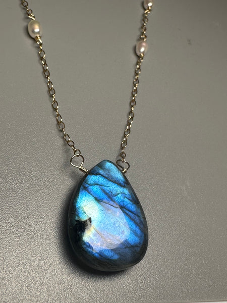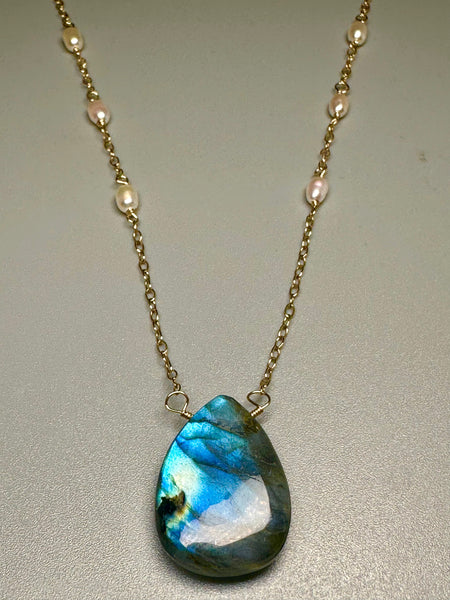 Features a smooth iridescent labradorite hand wired and wrapped on an open link gold-filled chain with pearl scaling the chain completed with a spring ring clasp, heart closure and signature mother of pearl star.