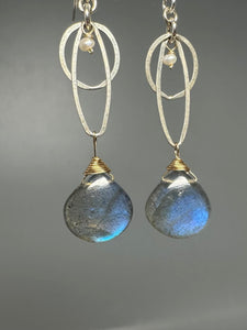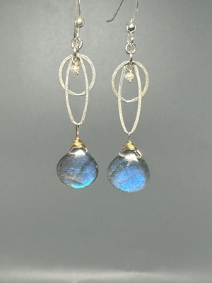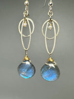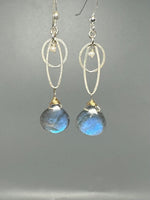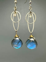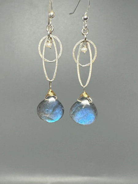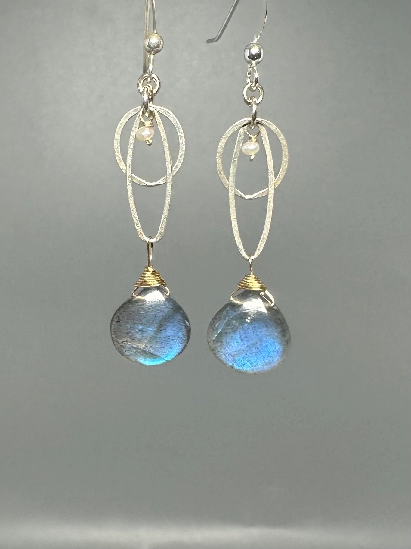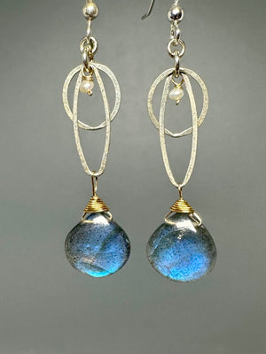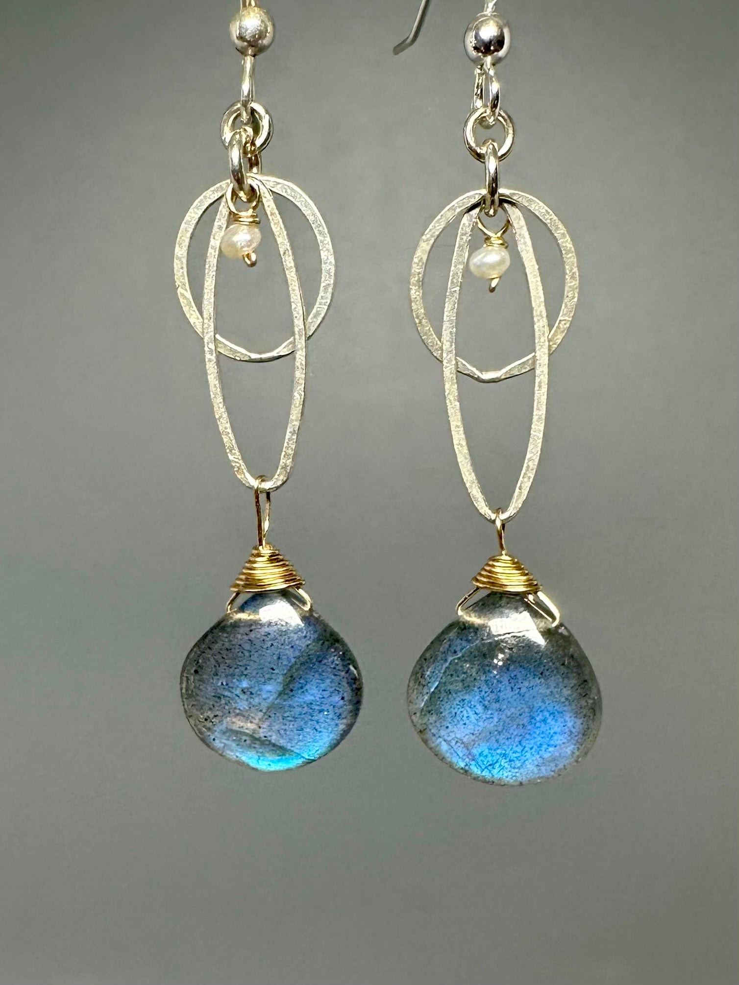 Features a beautifully blue iridescent smooth labradorite stone hand wired and wrapped in gold-filled on a sterling navette link, attached to a circular links and pearl accent stones hand; ball and hook ear-wire.