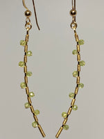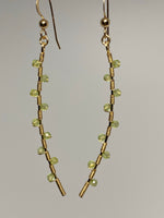 Features ten 2.5 mm faceted peridot stones hand wired and wrapped on a hand formed bar, attached to a ball and hook ear-wire.