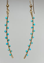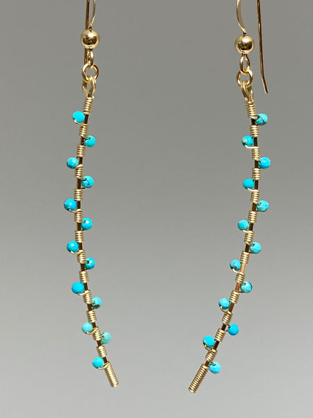 Feautures eleven faceted natural turquoise hand wired and wrapped on a stylized stick in 14k gold-filled, ball and hook ear-wire