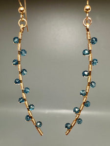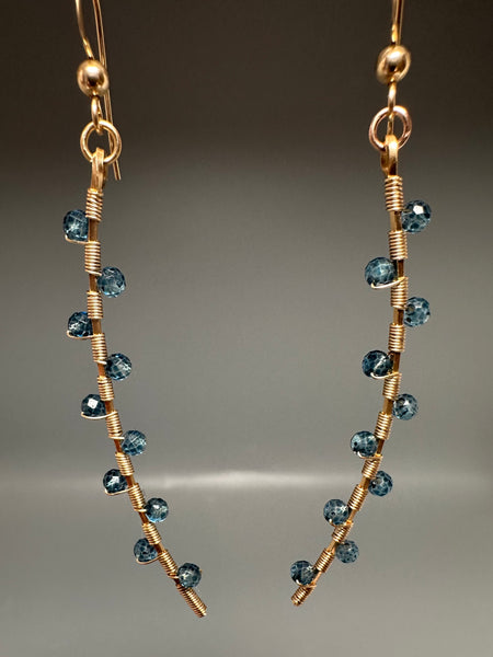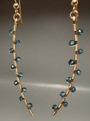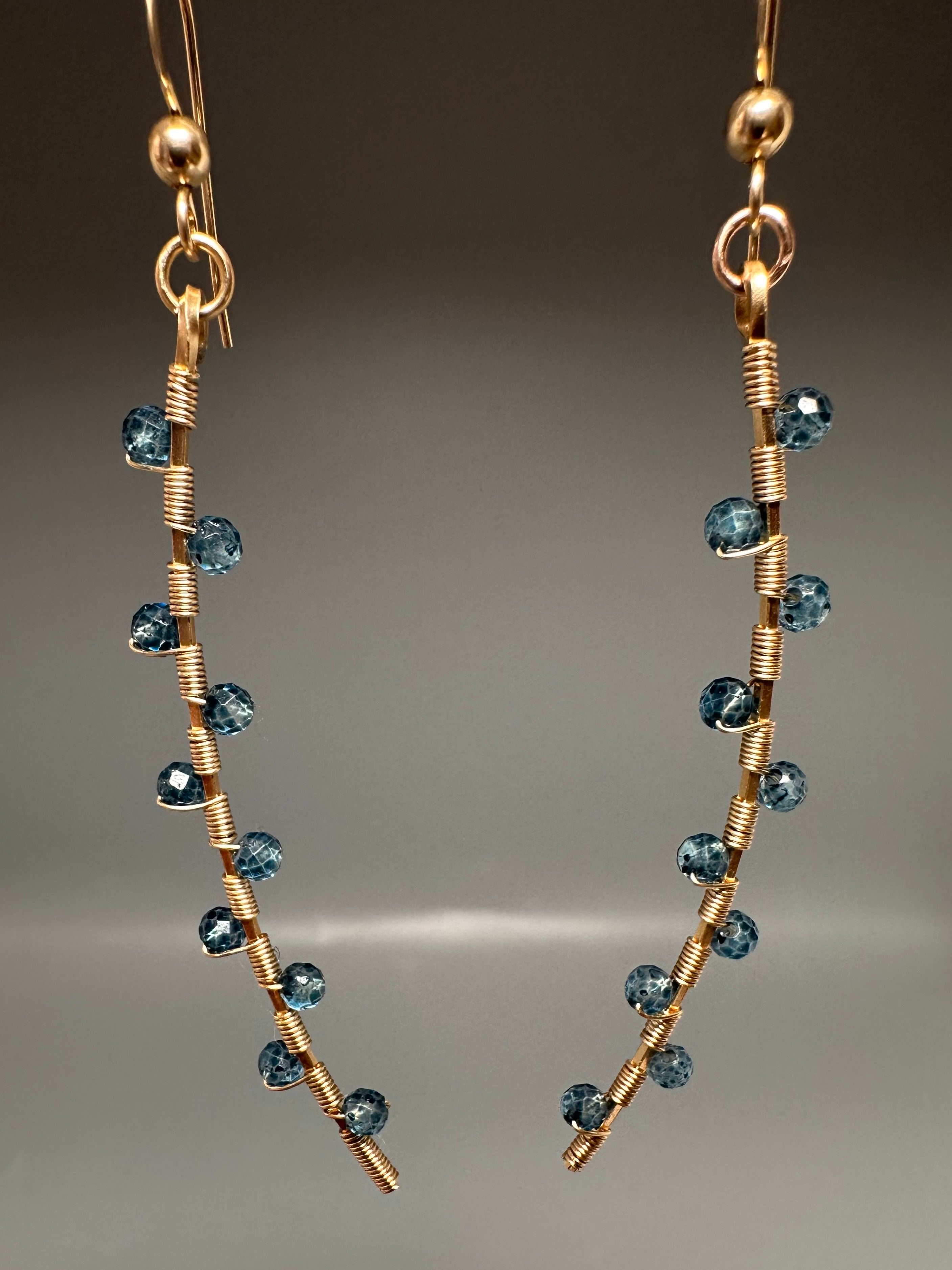 Each features ten 3.0 mm round faceted London Blue quartzstones hand wired and wrapped and on hand formed bar; ball and hook ear-wire.