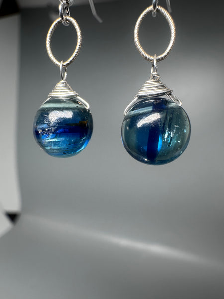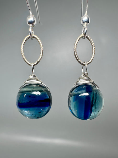 Striking natural kyanite orb drops in mesmerizing ocean-blue tones are hand-wrapped and suspended from sterling silver textured links, ball and hook ear-wires.