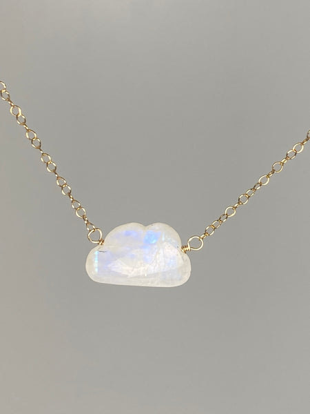 Features a carved rainbow moonstone cloud set on a delicate 14k gold-filled chain, completed with a spring ring clasp and signature mother of pearl star. L: 17”