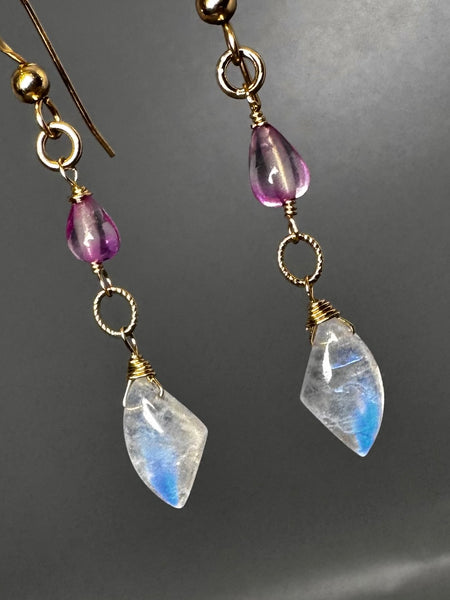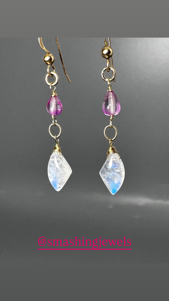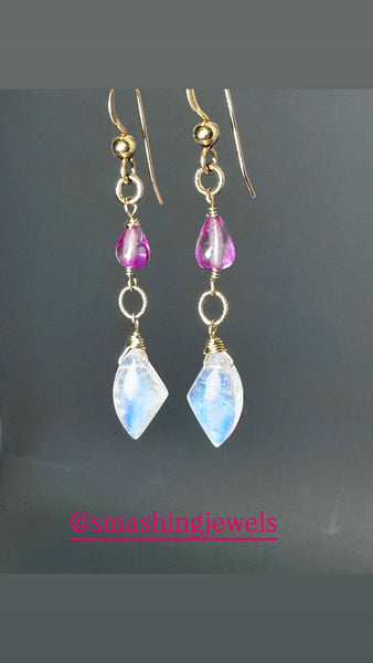 Features matching uniquely cut blue iridescent Moonstone stones hand wired in 14k gold filled; attached to a link topped with a smooth pink tear drop attached to a ball and hook ear-wire
