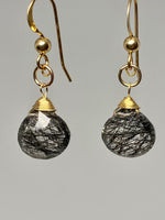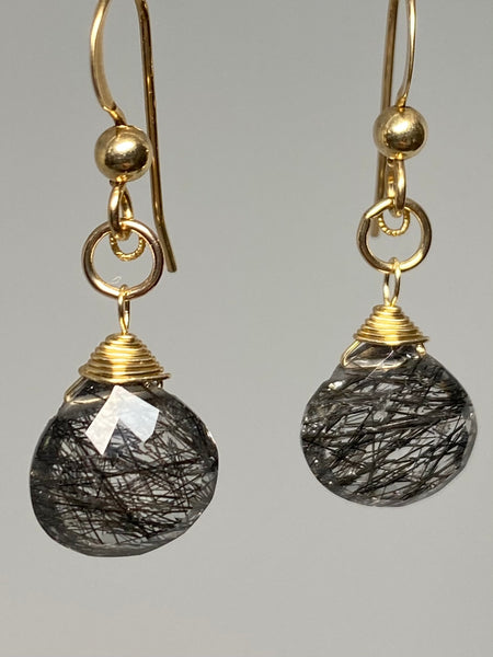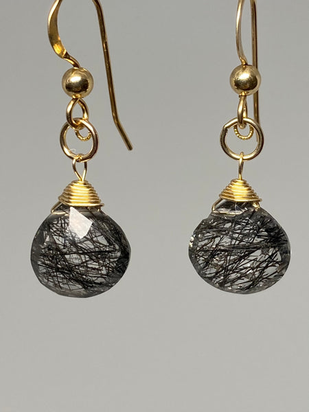 Features a faceted black rutilated Quartz stone attached to a ball and hook earwire.