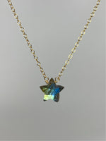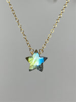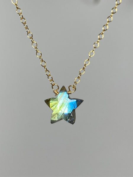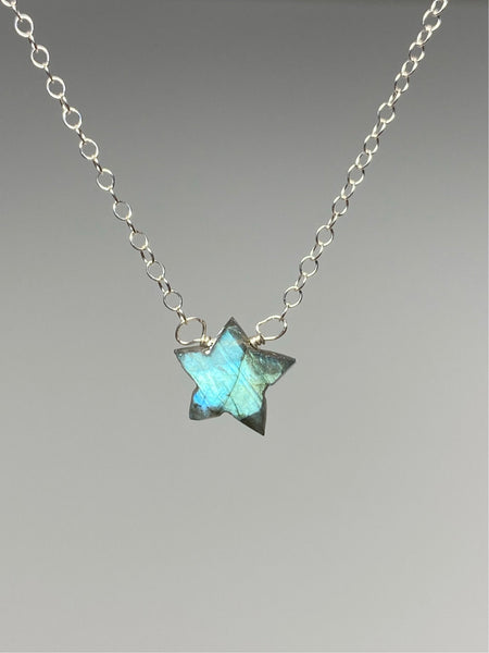 Centers a labradorite faceted Star hand wired and wrapped; attached to a delicate open link chain, completed with a spring ring clasp, signature mother of pearl star and heart closure.