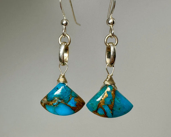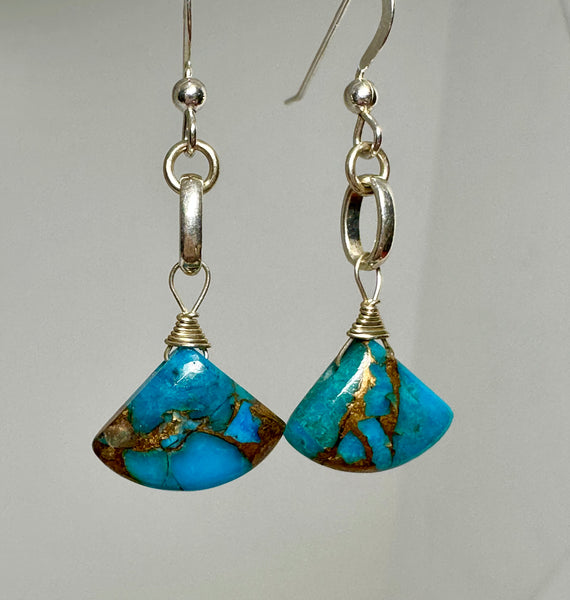 Features a blue turquoise mini fan shaped stone; hand wired and wrapped in sterling silver attached to a heavy link, ball and hook ear-wire.